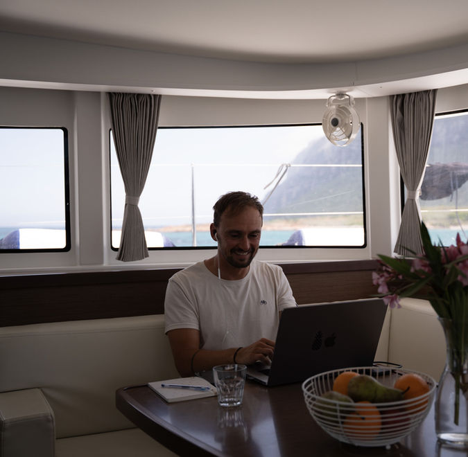 Our accommodation is a Lagoon 42 catamaran. It has four cabins, each with a private bathroom, electric toilet, and shower. The cabins can be booked individually as single cabins, but each is equipped with a queen-size bed and also offers enough space for two guests. The crew sleeps in dedicated crew cabins in the bow of the yacht. A spacious and light-filled saloon, the large galley, and the deck are the communal areas.