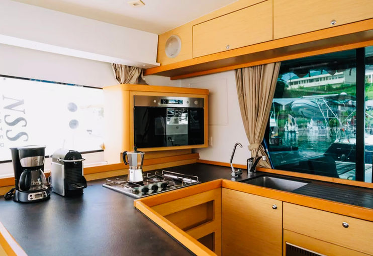 Er verfügt über 4 Kabinen, jeweils mit privatem Badezimmer, elektrischer Toilette und Duschkabine. Der geräumige Salon, die große Küche und das Außendeck sind die Gemeinschaftsräume. Zusätzliche Features sind der Wassermaker, eine A/C, sowie Generator und Inverter.